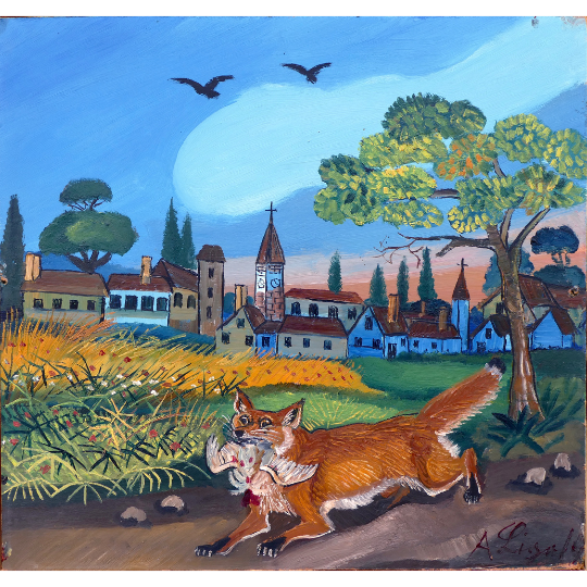 In this painting, as in many of his works, nature is neither idyllic nor neutral: it is the stage of a deeper truth, where beauty coexists with threat, and every creature carries within it a fragment of destiny. Fox with Hen is therefore far more than a rural scene: it is a reflection on fragility, on hunger—both physical and symbolic—and on what we are willing to do in order to survive.