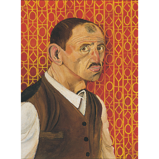 Ligabue neutralizes the background through the ornamental description of red wallpaper with diamond patterns and yellow circles. From this emerges, rendered with meticulous detail, the youthful and orderly figure of the painter, who examines himself in every facial fold and every crease of his clothing. A faint shadow on the wallpaper reveals his skill in chiaroscuro and depth.
