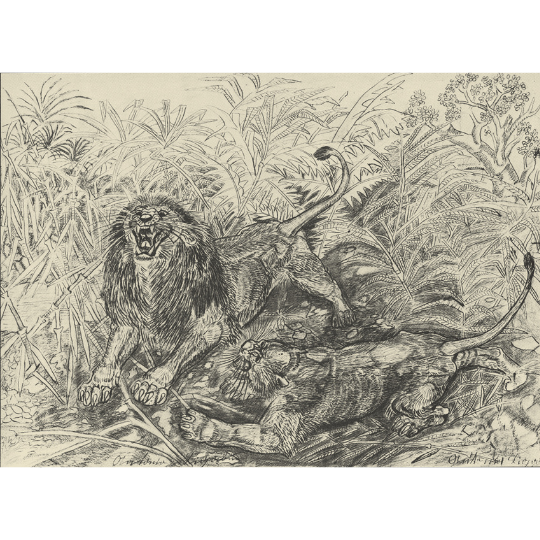 The background reveals an effort to populate the violent act with a crowded surrounding space—an horror vacui that fuels the aggression of the foreground, placing the two fighting beasts on the same plane as a luxuriant nature that itself struggles to claim space on the sheet. Masses are defined through dense black-and-white contrasts, created by the accumulation of strokes that release their tension along the contours of the figures.
