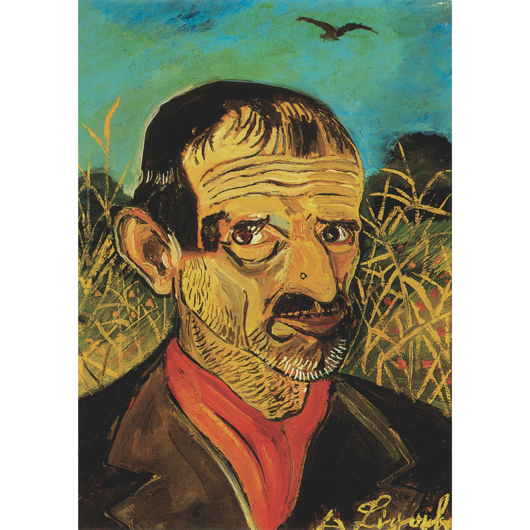 Wrapped in his familiar brown jacket and red scarf, with a gaunt face, bristly beard, and graying hair, the artist appears with a sad, lost gaze. He evokes a condition of profound existential isolation, echoed by the solitary crow crossing the evening sky. In the background, a wheat field seems to envelop the figure, while a thin line of vegetation completes the perspective.