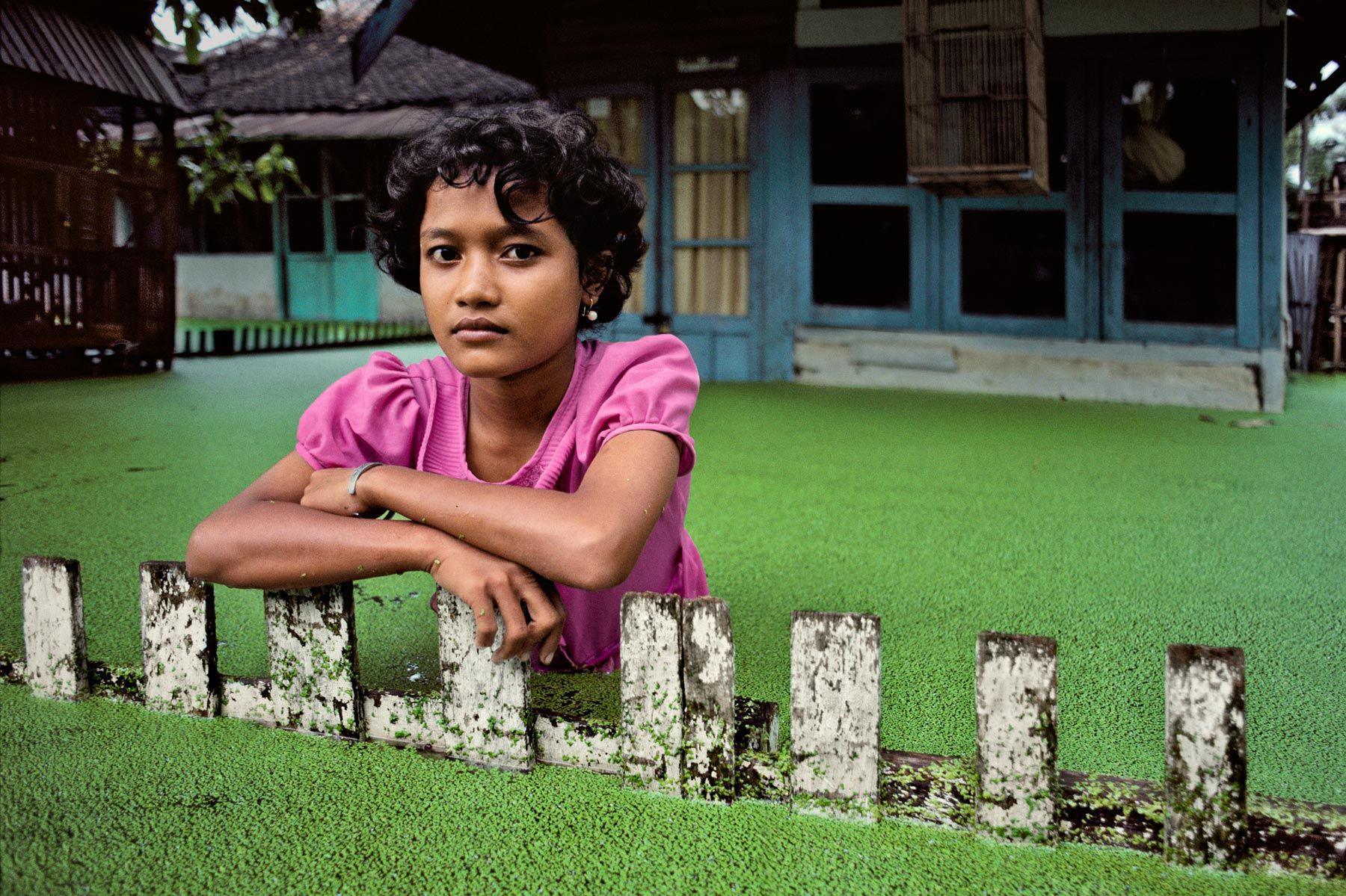 And yet, in the gentle ripples of water covered with tiny floating plants, lapping against a white fence—and in the calm expression of the girl’s face—life goes on.